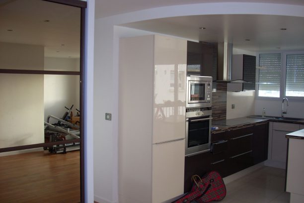 Démolition des murs (cuisine, chambres, séjour, salle de bain, WC), dépose des carrelages et des revêtement muraux, dépose tableau électrique, dépose de la tuyauterie (salle de bain et cuisine), création de murs et cloison pour séparation de pièce, création de faux plafonds deux niveaux, éclairage suspendus, installation tableau électrique, installation tuyauteries PVC et cuivre, fourniture et pose de carrelage mur et sol (salle de bain et cuisine), dépose, fourniture et pose fenêtres, installation portes fenêtres double vitrage sur mesure, volets électrique, fourniture et pose parquet chêne, création de placard suspendus sur mesure, fourniture et pose de meuble de cuisine sur mesure.