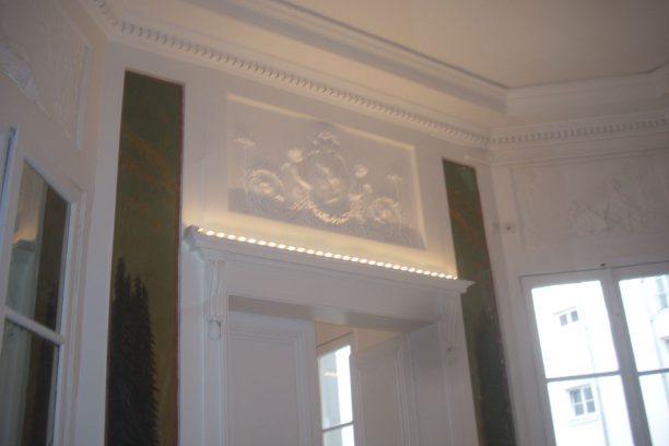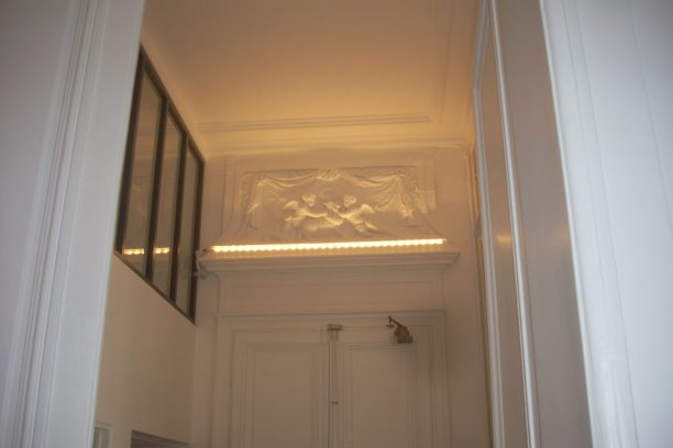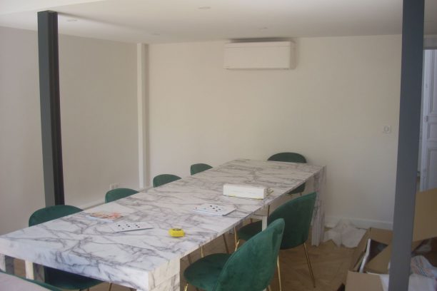 Démolition et rénovation blanche , électricité , plomberie , chaudiere , Parquet versailles , création d’une Mezzanine en acier sur mesure , fourniture et pose verrières sur mesure , montage des escaliers.